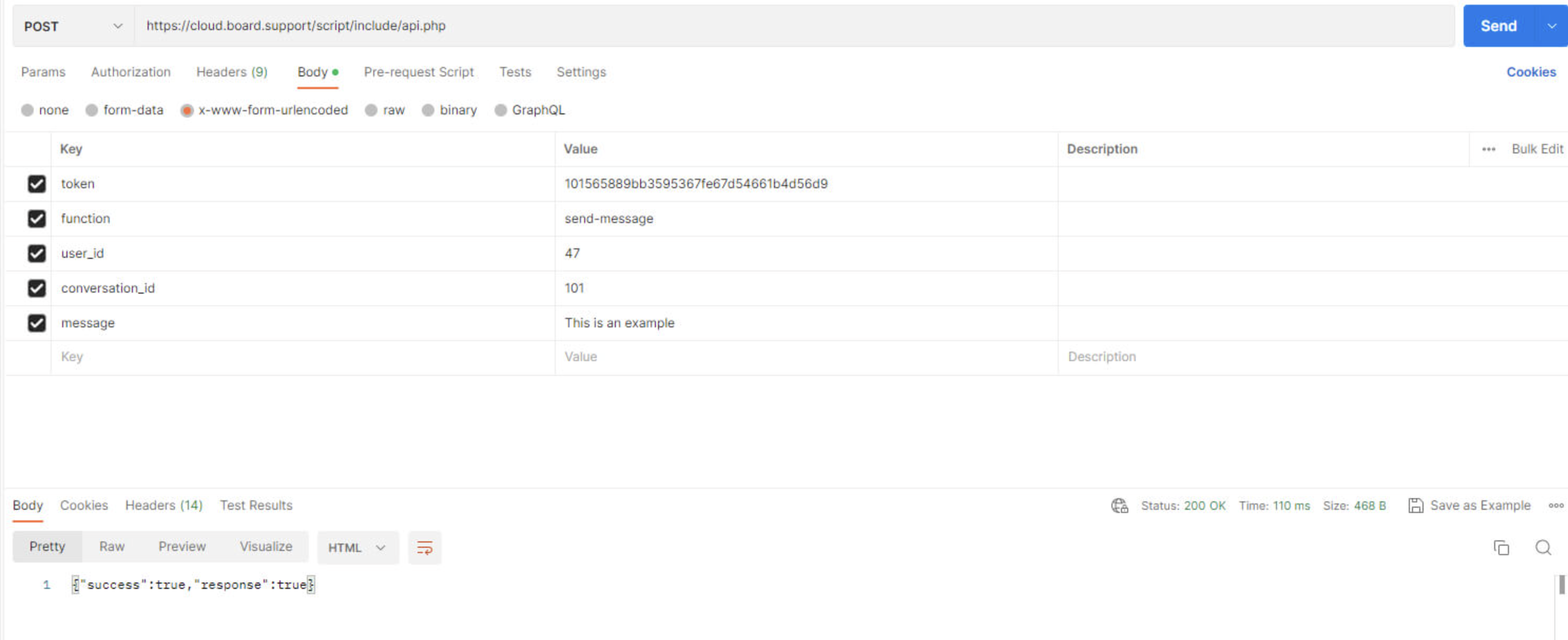 La variable $response contendrá la respuesta en formato JSON. Puede añadir nuevos argumentos en el array de la consulta: ['token' => '', 'function' => '', 'argument-name' => 'value', ...].