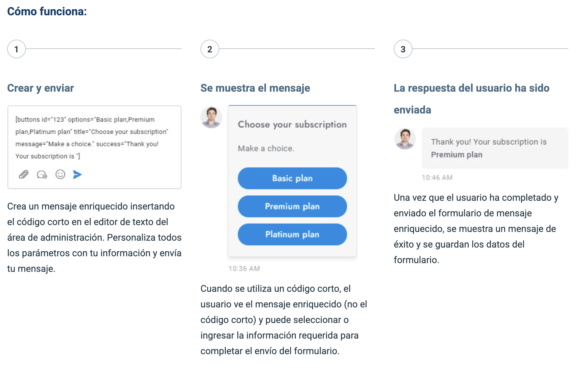 Los mensajes enriquecidos son mensajes especiales con funciones interactivas como botones, menús desplegables o entradas. Permiten que un agente solicite información al usuario mediante un formulario de entrada o muestre contenido interactivo. Se pueden insertar en un mensaje de chat mediante códigos cortos. Estos códigos aceptan diversos parámetros, como el título y la descripción. Los mensajes enriquecidos disponibles se enumeran a continuación.